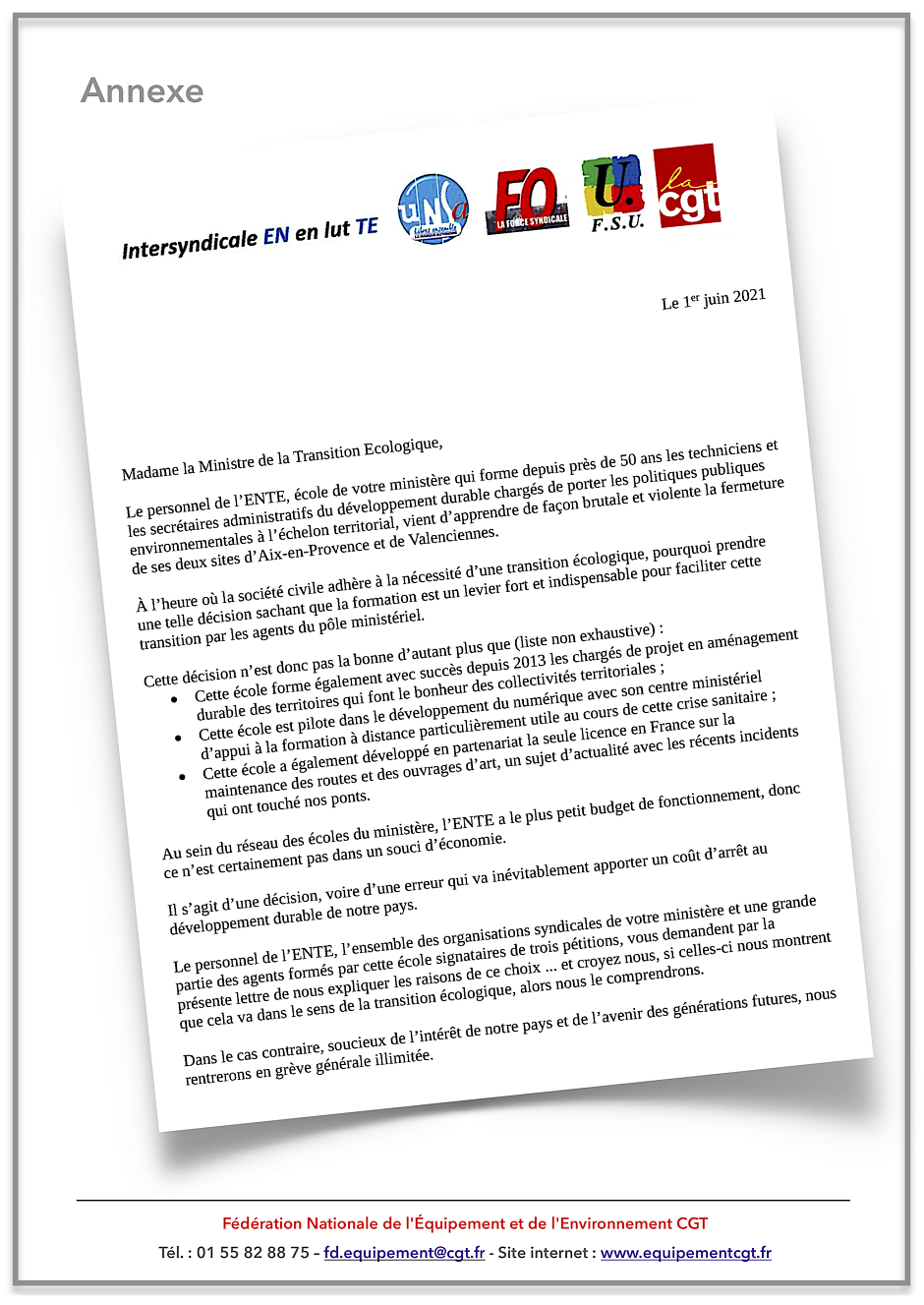 Ci-joint le 4 pages CGT et son annexe (le courrier de l’intersyndicale en lutte Unsa-FO-FSU-CGT en date du 1er juin 2021, adressé à la ministre de la Transition Écologique).