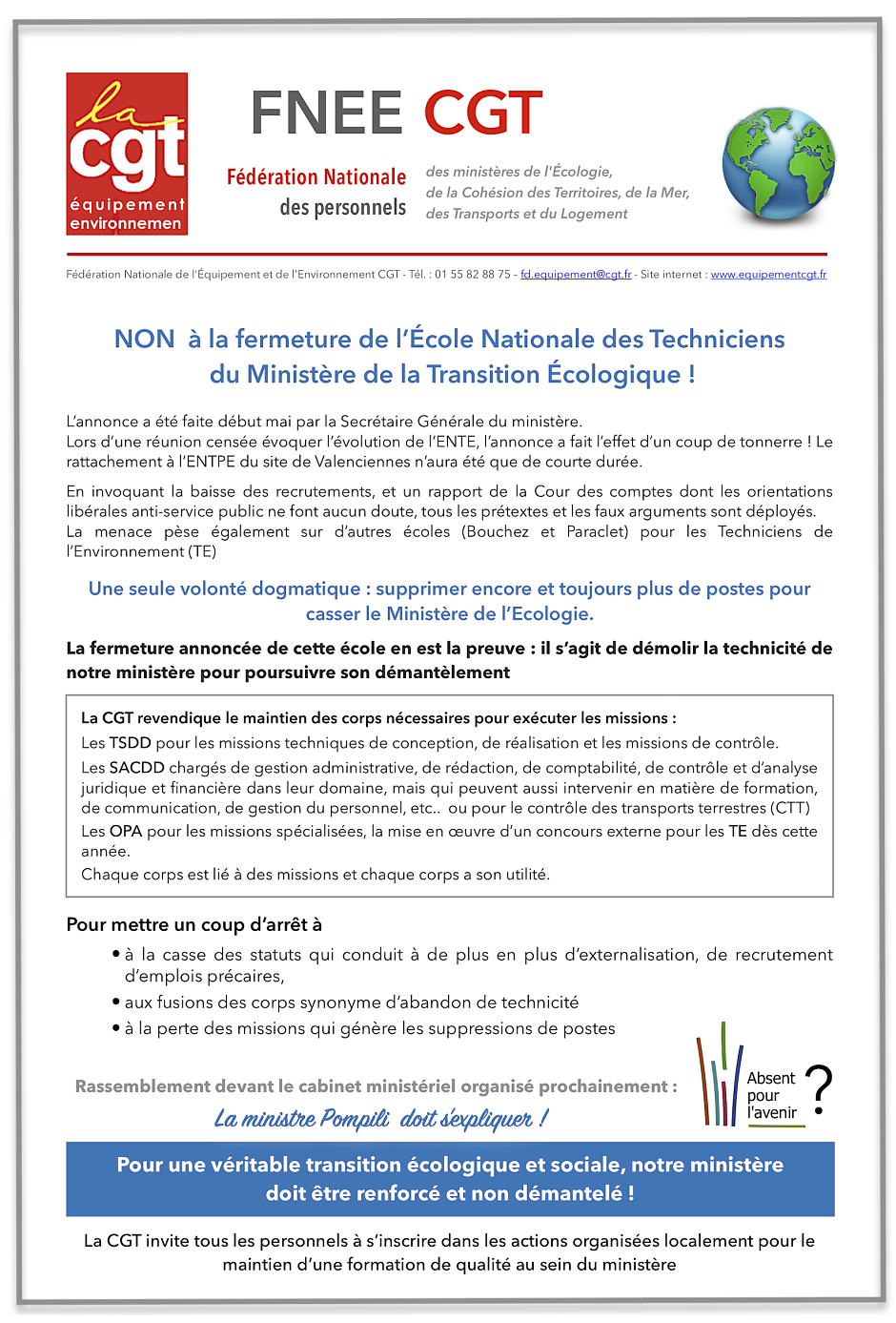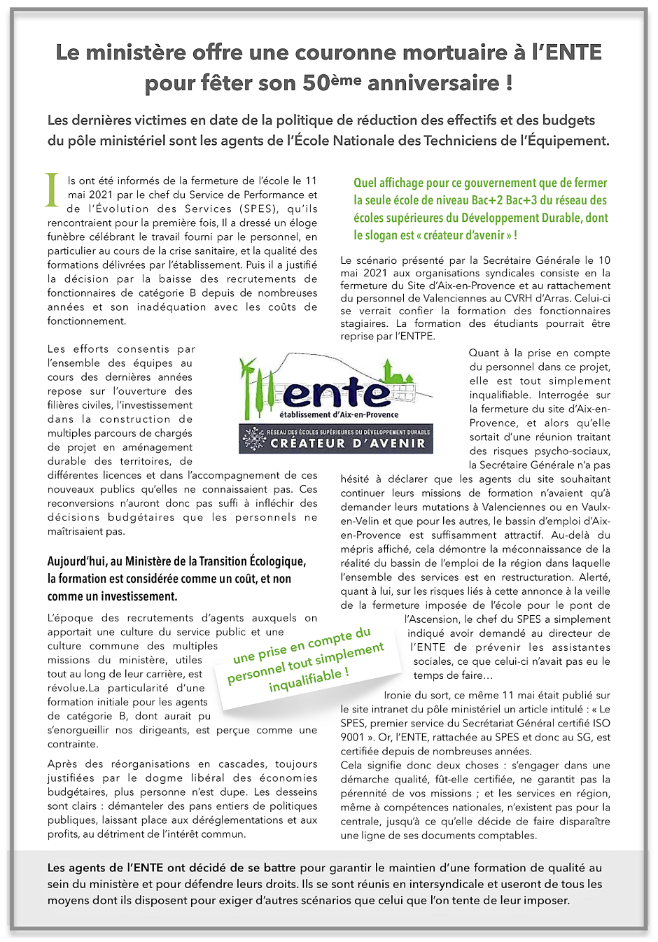 Page 4 : Pour la CGT, il faut investir dans la formation des acteurs de terrain dans le domaine du développement durable - Le « Fil » des MTE-MCT-Mer du 27 mai 2021 : « L’ENTE retenue parmi les 74 classes prépas