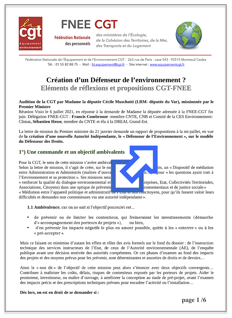 Ci-joint les positions de la FNEE-CGT sur la mission défenseur des droits de l’environnement, suite à l’audition du 6 juillet de la FNEE-CGT : éléments de réflexions et propositions envoyées à la députée missionnée par le Premier Ministre.