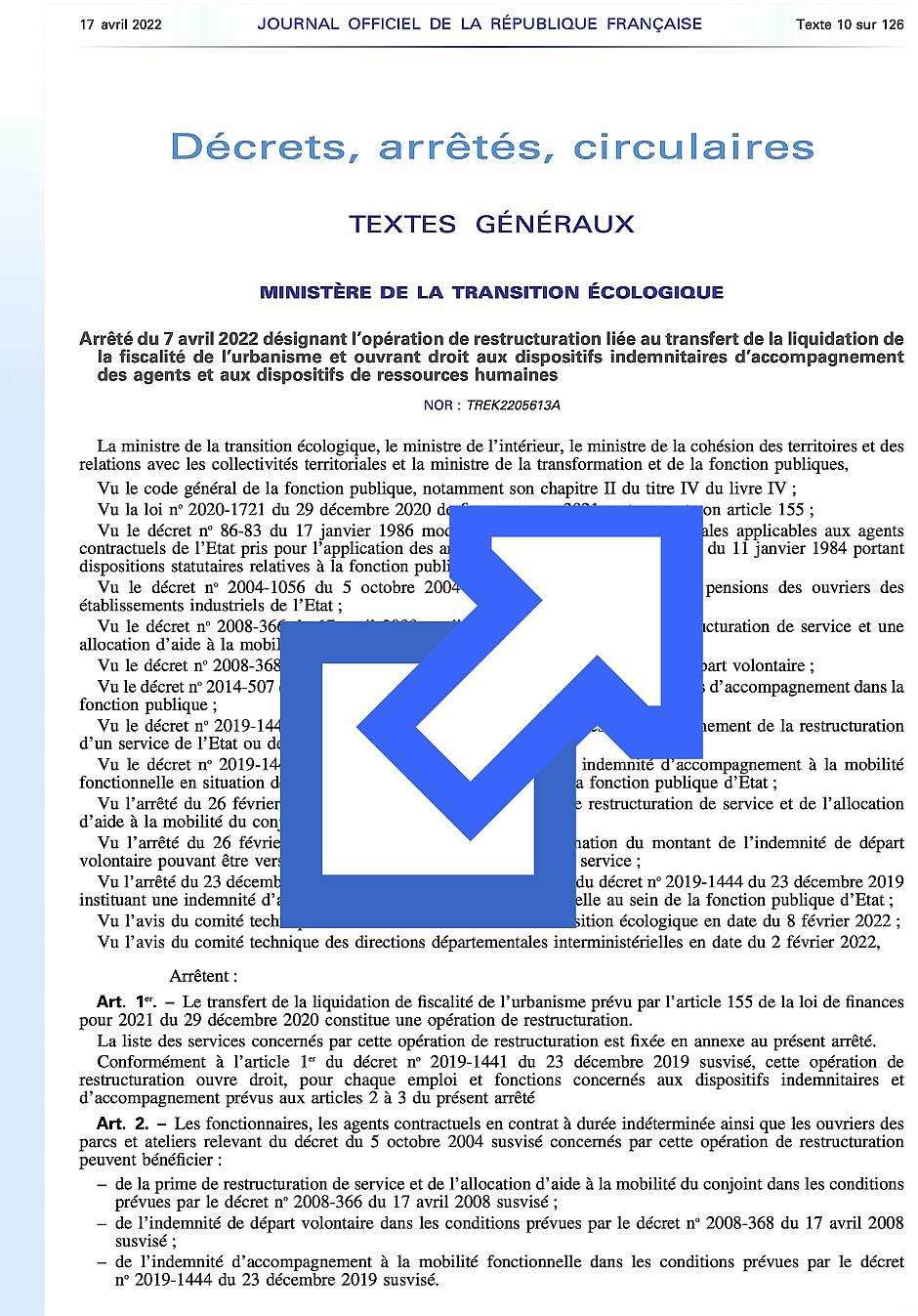 Arrêté du 7 avril 2022 publié au JO du 17 avril 2022 désignant l’opération de restructuration liée au transfert de la liquidation de la fiscalité de l’urbanisme et ouvrant droit aux dispositifs indemnitaires d’accompagnement des agents et aux dispositifs de ressources humaines.