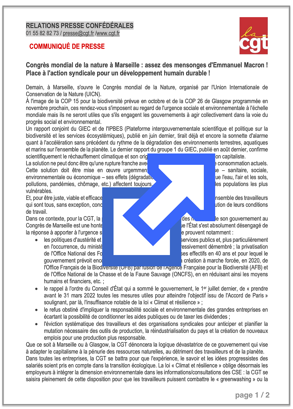 "Pour la CGT, la participation d’Emmanuel Macron et des membres de son gouvernement au Congrès de Marseille est une honteuse mascarade car la réalité c’est que l’État s’est absolument désengagé de la réponse à apporter à l’urgence sociale et environnementale comme le prouvent notamment :