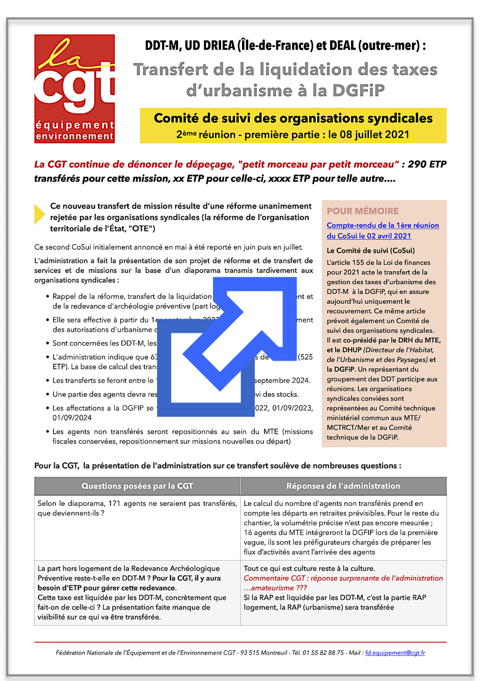 ● Déclaration liminaire lue à l’ouverture du CoSui de transfert des taxes d’aménagement qui s’est déroulé le 08 juillet 2021 (déclaration commune CGT Équipement et CGT Finances).