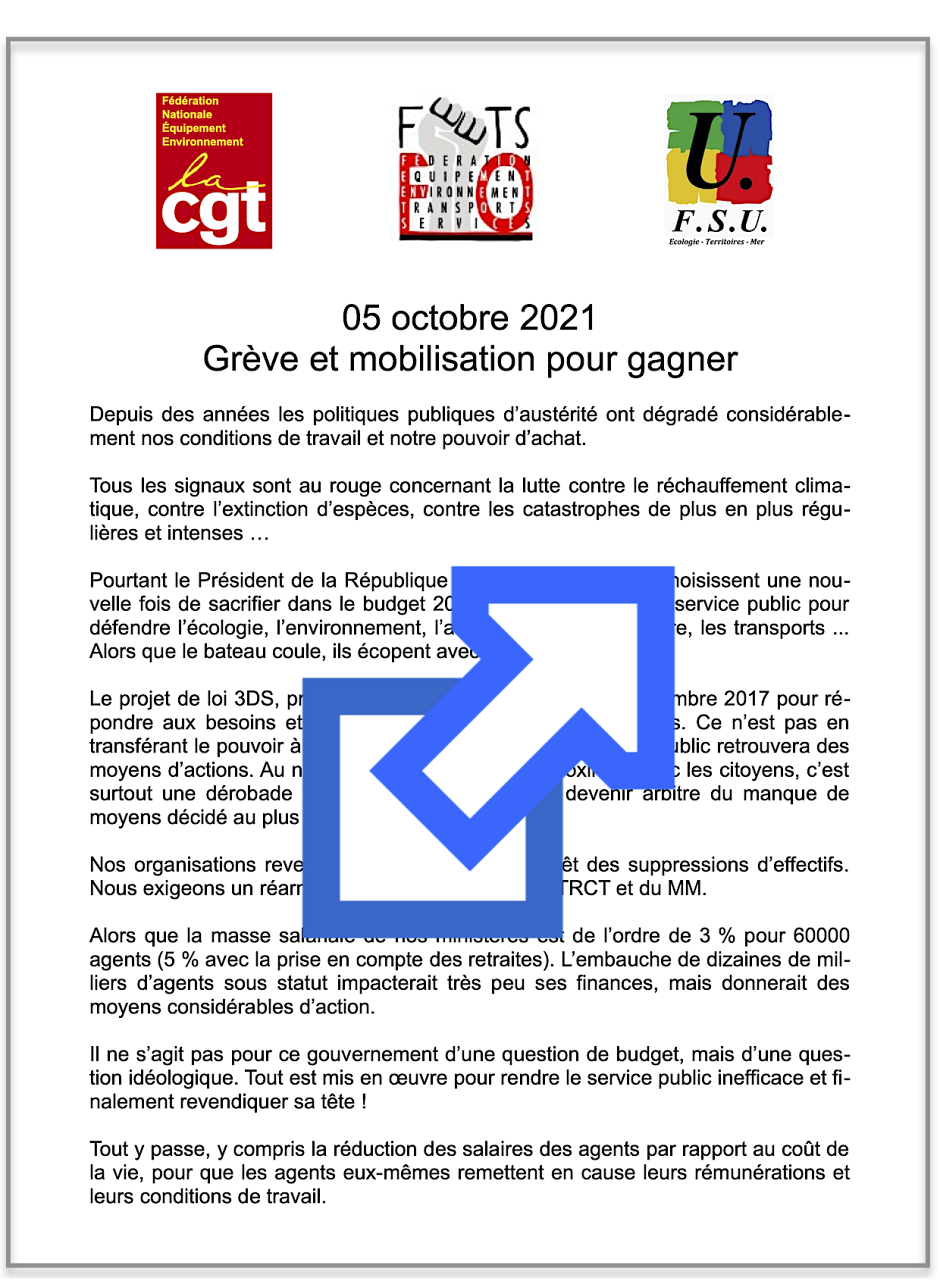 Appel commun des fédérations CGT ; FO ; FSU et Préavis de grève envoyé aux ministres des MTE-MCTRCT-MM pour la journée du 05 octobre 2021 ainsi que pour les nuitées en amont et en aval de celle-ci pour les agents travaillant en horaires décalés.