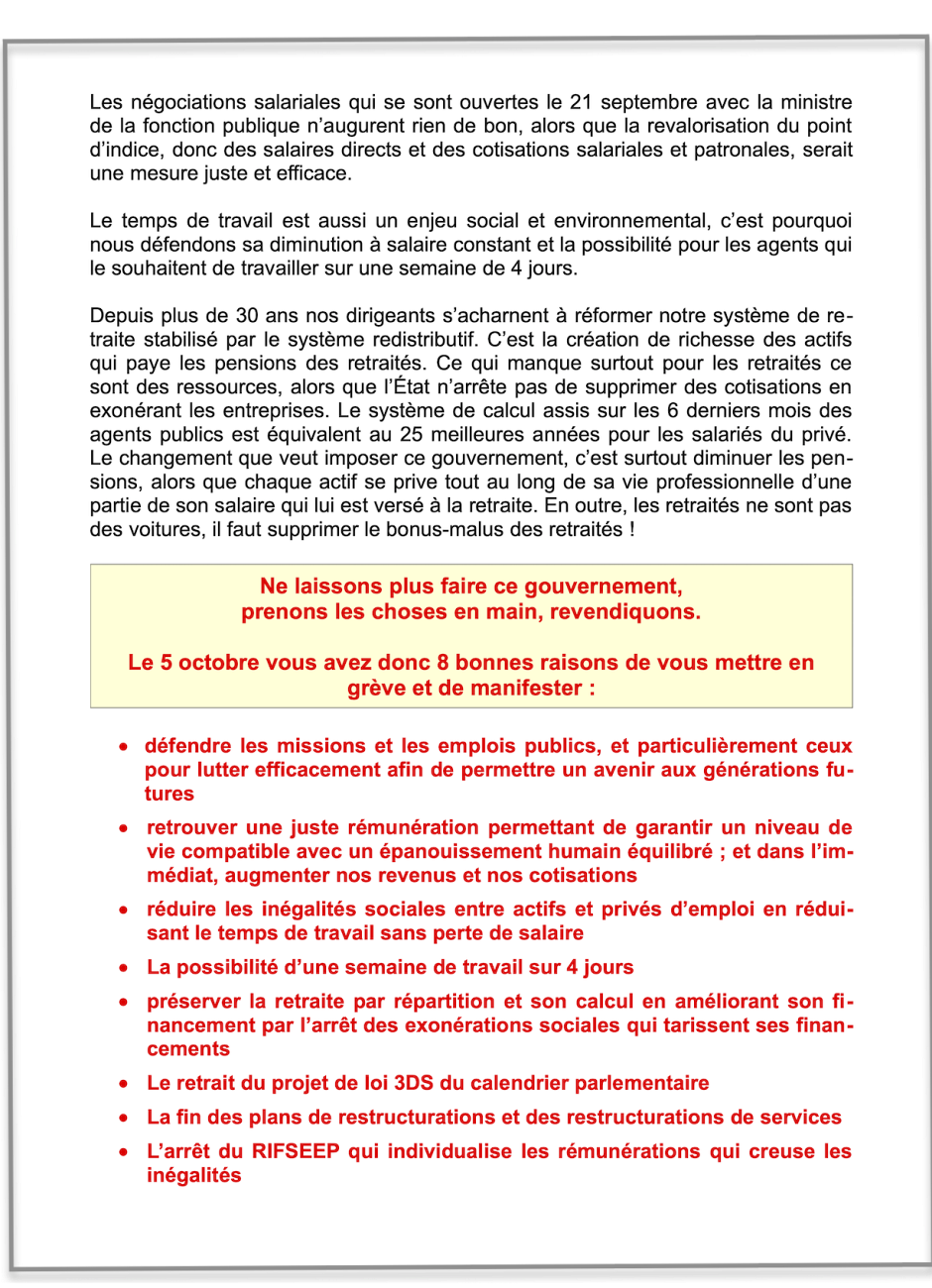 Les négociations salariales qui se sont ouverte le 21 septembre avec la ministre de la fonction publique n’augurent rien de bon, alors que la revalorisation du point d’indice, donc des salaires directs et des cotisations salariales et patronales, serait une mesure juste et efficace.
