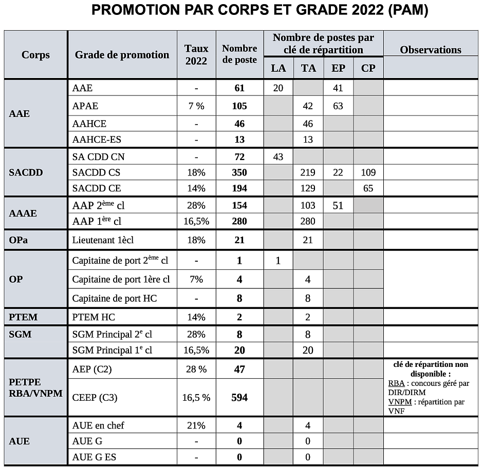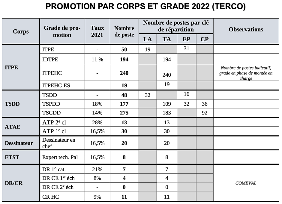 Courrier DRH du 29 novembre 2021 adressé aux organisations syndicales : infos disponibles sur le nombre de postes par Liste d’aptitude (LA), Tableau d’avancement (TA), Exa. pro (EP) et Concours pro. (CP).