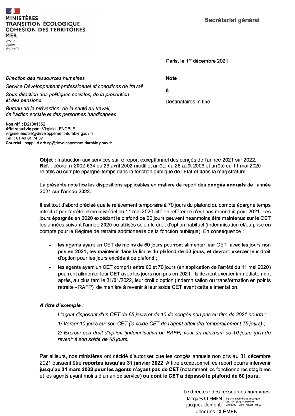 MTE-MCT-MM : Note DRH adressée aux services le 1er décembre 2021, relative au report exceptionnel des congés de l’année 2021 sur 2022 et aux règles d’utilisation du compte épargne temps (CET).