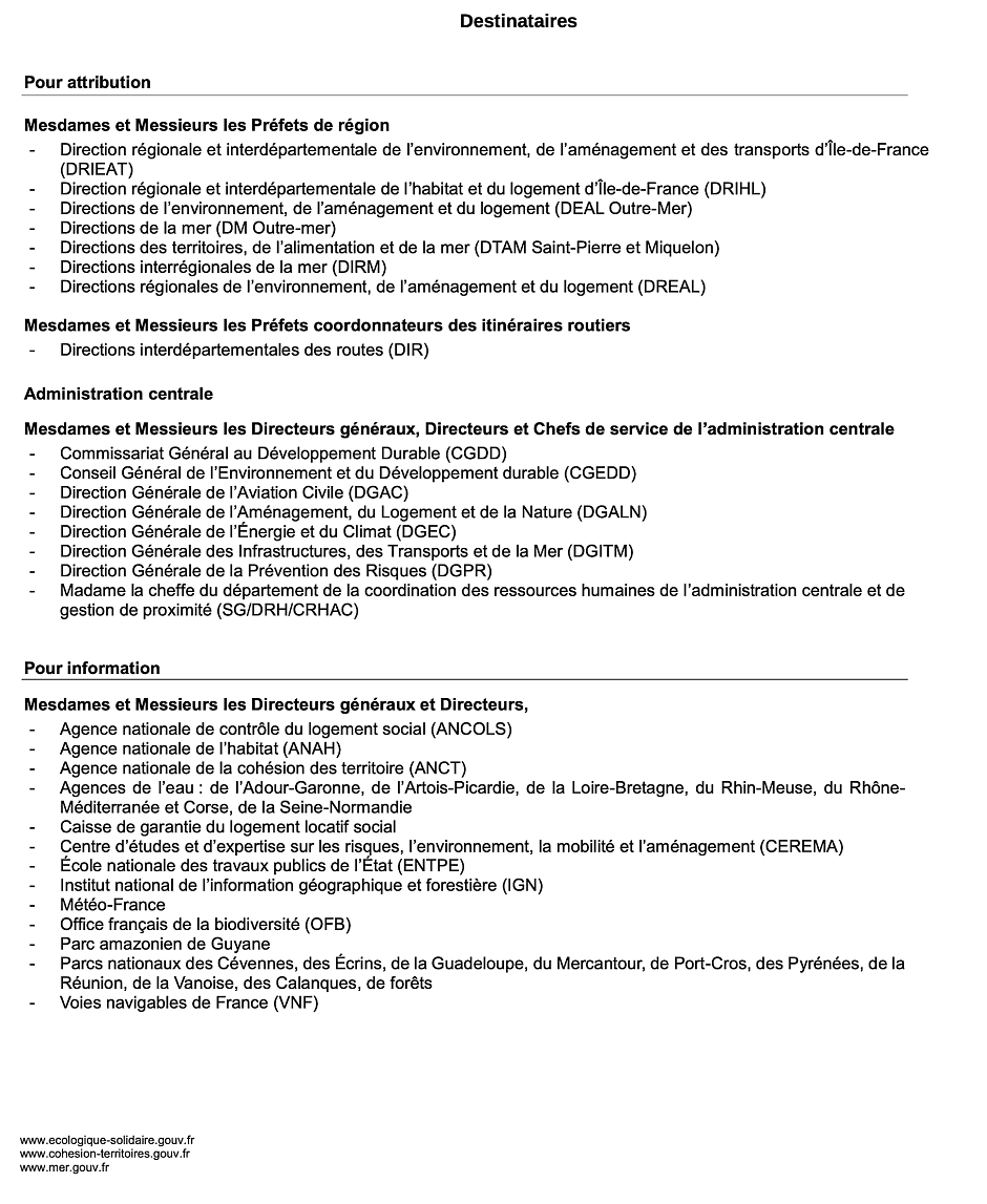 - Directeurs généraux et Directeurs : VNF ; OFB ; ANAH ; ANCOLS ; CEREMA ; IGN ; IFSTTAR ; Caisse de garantie du logement locatif social ; Agences de l’eau ; Météo-France ; Parc amazonien de Guyane ; Parcs nationaux et ENTPE