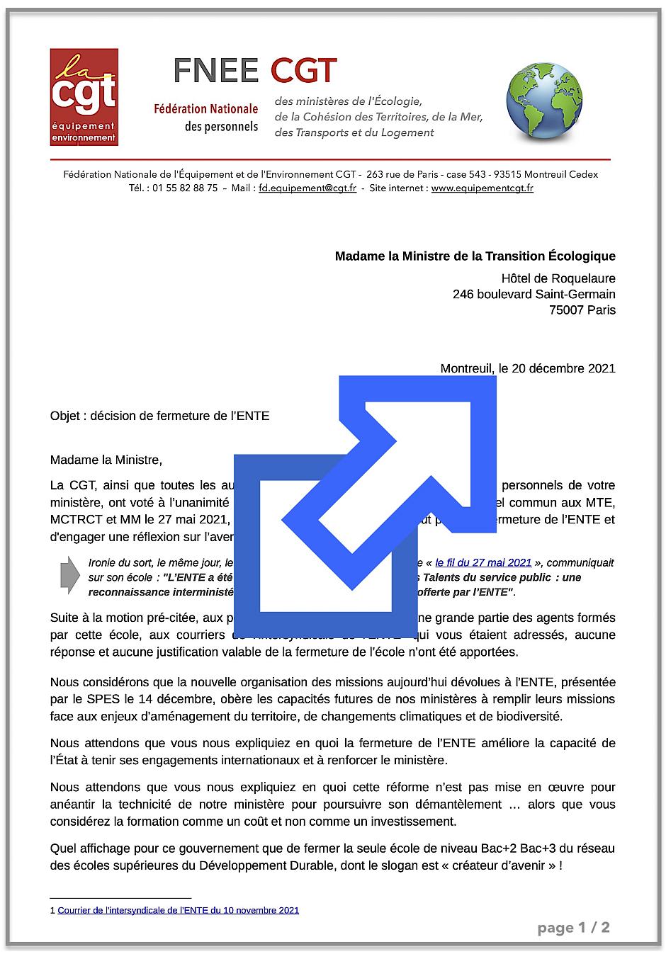 Courrier FNEE-CGT envoyé à la ministre Ministre de la Transition Écologique le 20 décembre 2021, suite à l’annonce de la décision politique de fermeture de l’ENTE en tant qu’établissement de formation à l’échéance de mi 2023 (pas de rentrée en septembre 2023).