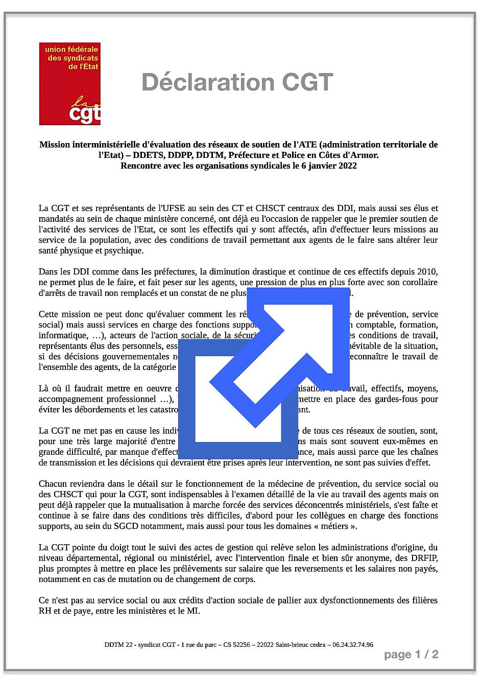 La Déclaration CGT DDETS, DDPP, DDTM, Préfecture et Police en Côtes d’Armor lue lors de la rencontre avec la Mission le 6 janvier 2022