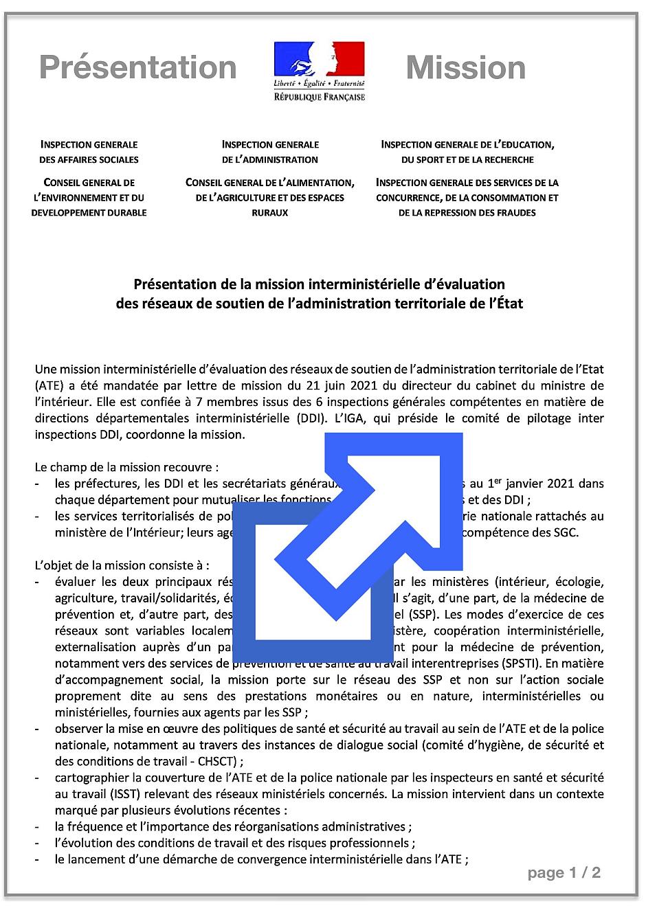 Une mission interministérielle d’évaluation des réseaux de soutien de l’Administration Territoriale de l’État (ATE) a été mandatée par lettre de mission du 21 juin 2021 du directeur du cabinet du ministre de l’intérieur. Elle est confiée à 7 membres issus des 6 inspections générales compétentes en matière de directions départementales interministérielle (DDI). L’IGA, qui préside le comité de pilotage inter-inspections DDI, coordonne la mission.