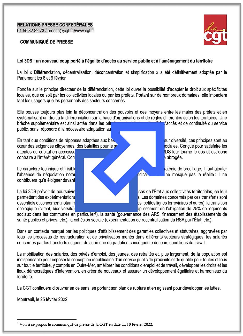 Communiqué de presse CGT du 25 février 2022 suite à la promulgation de la Loi n° 2022-217 du 21 février 2022 relative à la Différenciation, la Décentralisation, la Déconcentration et portant diverses mesures de simplification de l’action publique locale (Loi 3DS).