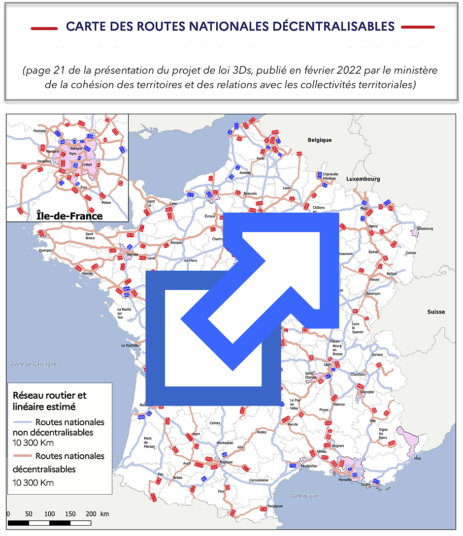La Loi dite « 3Ds » adoptée en février 2022 permet le transfert d’environ 400 voies du réseau national, soit 10 000 km de routes et autoroutes non concédées aux départements, métropoles et régions volontaires. (Expérimentation de 8 ans pour les régions, dans le cadre d’une mise à disposition des routes, du personnel et des moyens techniques concernés).