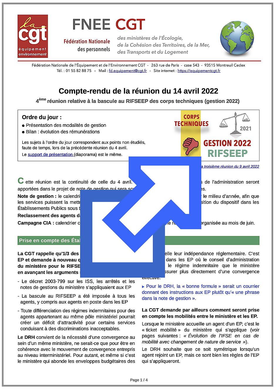 Compte-rendu CGT de la 4e et dernière réunion du 14 avril 2022 relative à la bascule au RIFSEEP des corps techniques (gestion 2022).
