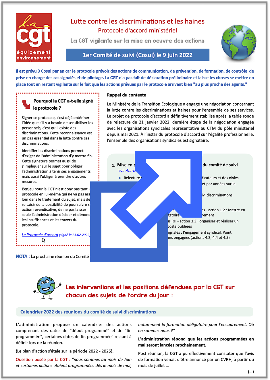 Ci-joint le compte-rendu CGT du 1er Comité de suivi relatif au protocole d’accord de lutte contre les discriminations et les haines qui s’est déroulé le 9 juin 2022, ainsi que le protocole et son annexe pour mémoire.