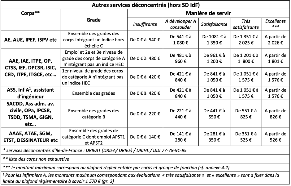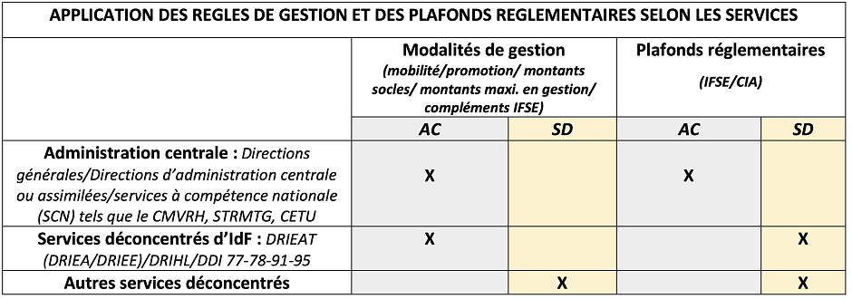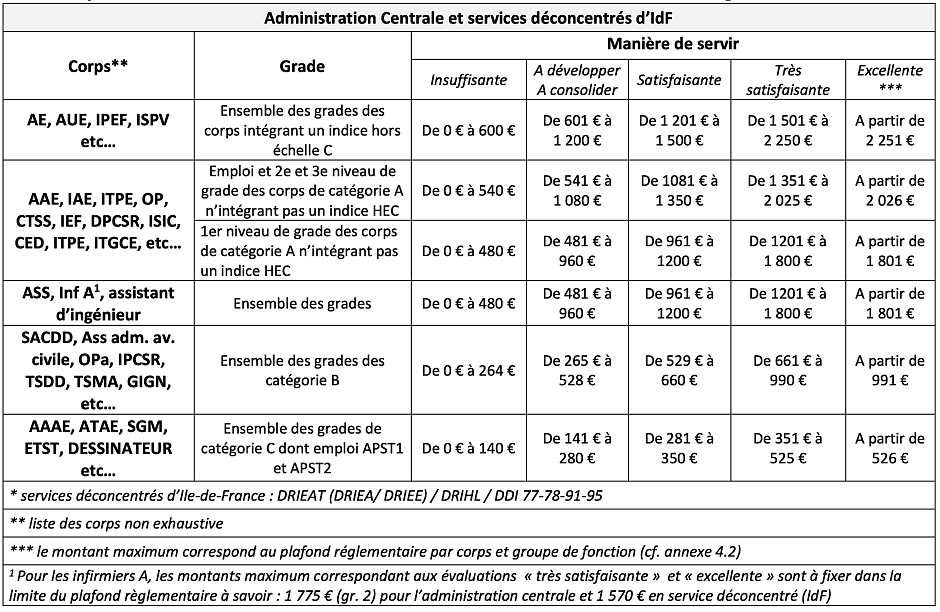 Si les agents au RIFSEEP, affectés dans les services déconcentrés d’IdF, bénéficient d’une IFSE dont les montants sont gérés à l’identique des agents affectés en AC, les montants règlementaires (plafonds) applicables aux mêmes corps demeurent ceux des services déconcentrés.