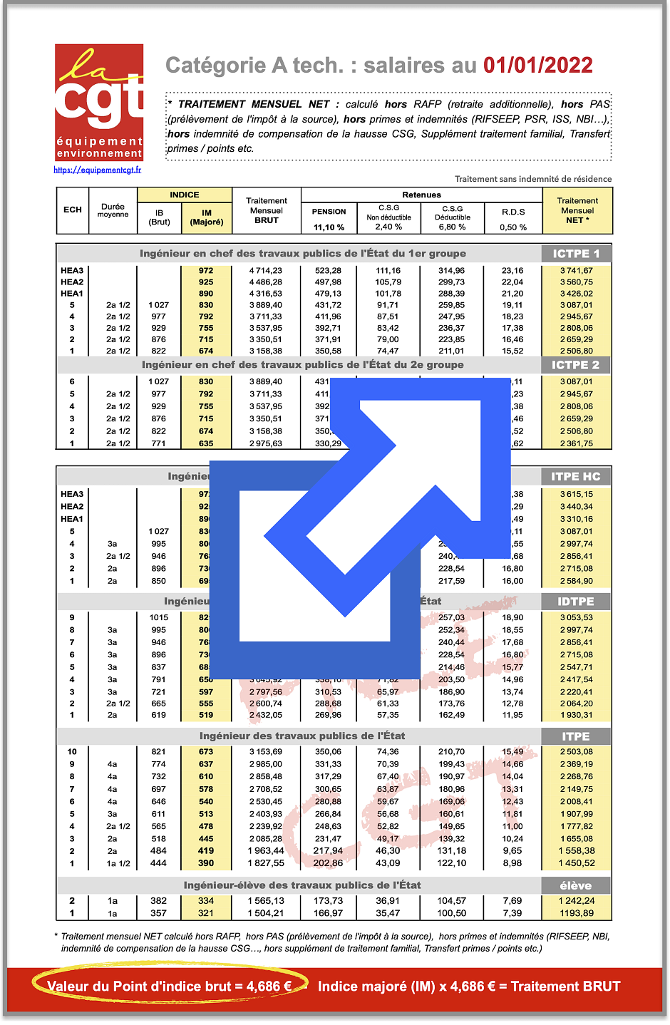 Vous trouverez ci-joint la grille de salaires pour les Ingénieurs des travaux publics de l’État (ITPE) et l’emploi fonctionnel (ICTPE) applicable à compter du 1er juillet 2022.