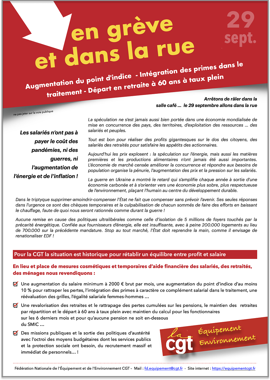 Ci-joint le préavis de grève CGT/FSU pour la journée du jeudi 29 septembre 2022 adressé le 16 septembre au Ministre de la Transition écologique et de la Cohésion des Territoires ainsi que l’appel de la FNEE-CGT.