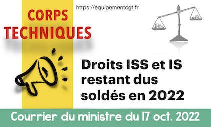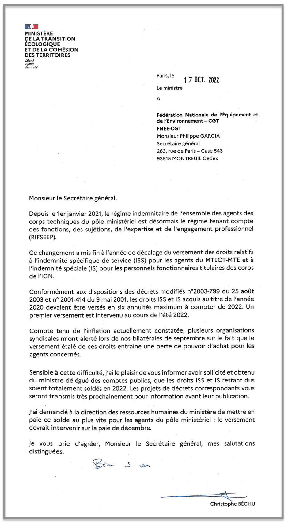Courrier CGT relatif au paiement de l’année de retard de l’Indemnité Spécifique de Service suite à la bascule au RISEEP des corps techniques, adressé aux ministres le 26 avril 2022.
