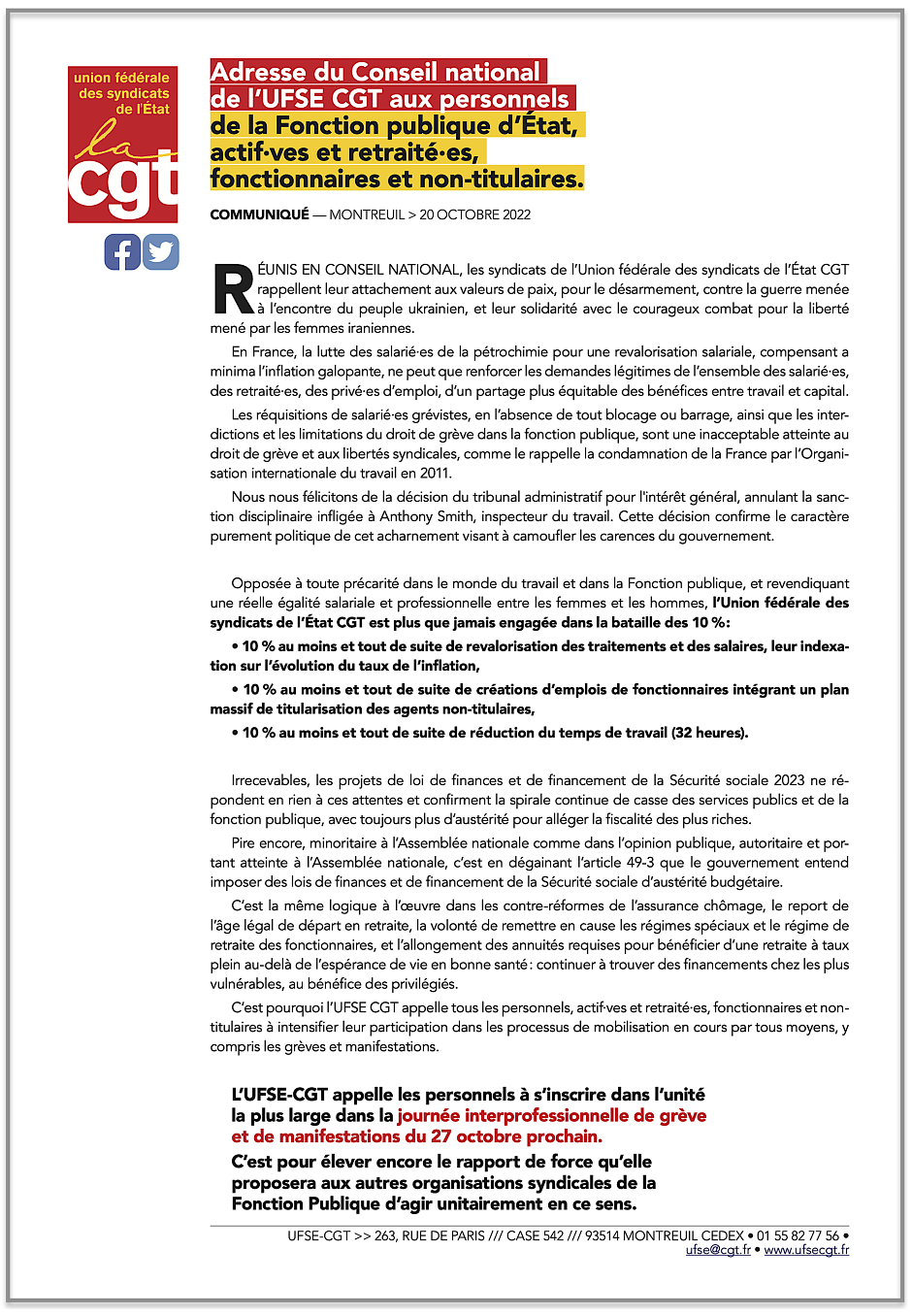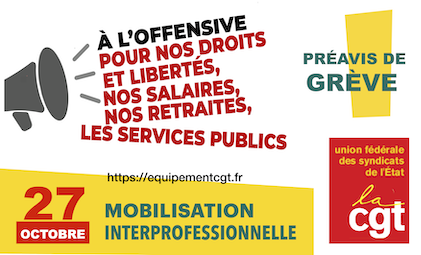 La CGT appelle à deux journées nationales d’action interprofessionnelle les 27 octobre et 10 novembre prochains : ci-joint le tract CGT, le communiqué UFSE-CGT pour le 27 octobre et le préavis de grève du 18 au 31 octobre 2022 pour tous les personnels de la Fonction Publique d’État.