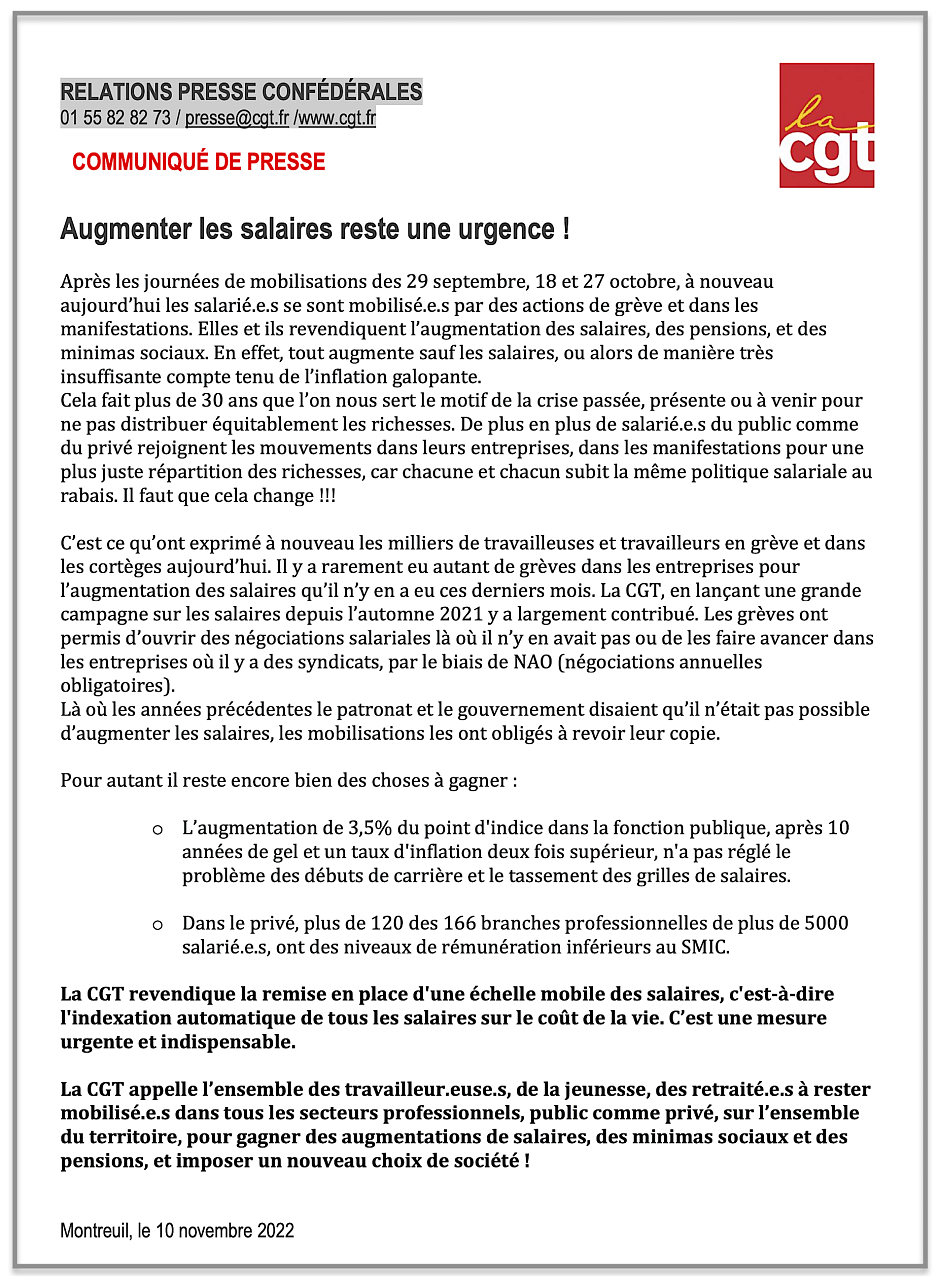 Vous trouverez ci-joint le communiqué de la confédération en date du 10 novembre 2022.