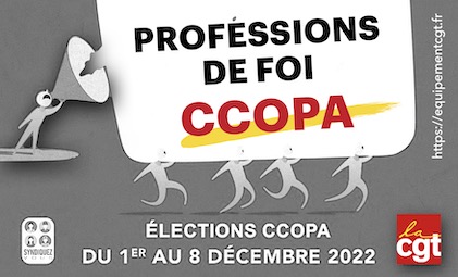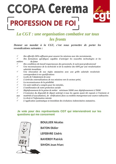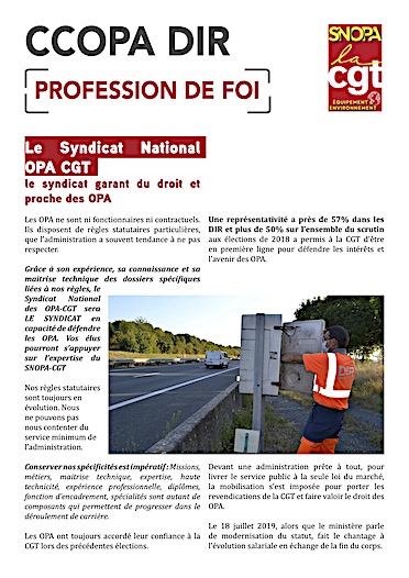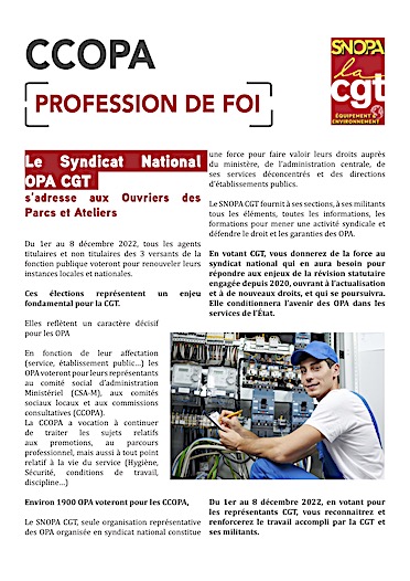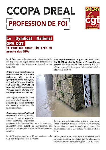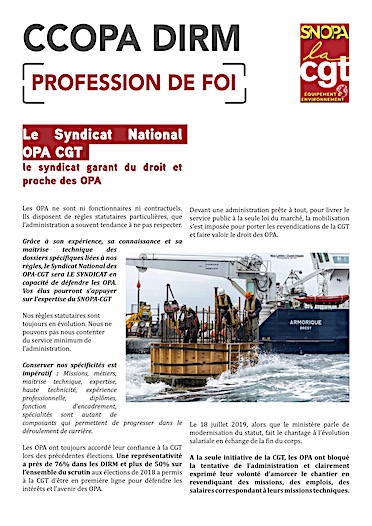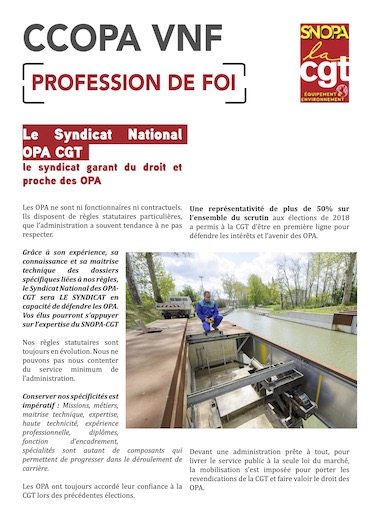 Vous trouverez ci-joint la profession de foi générale relative aux CCOPA : adresse du Syndicat National OPA CGT ainsi que les professions de foi spécifiques pour les OPA en DREAL, DIR, DIRM, VNF et Cerema.