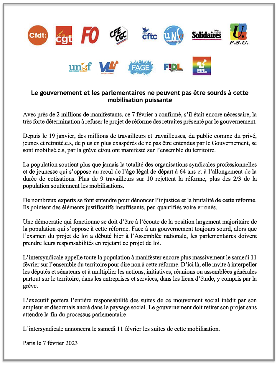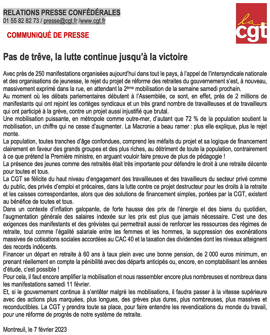 Communiqué de presse CGT et le Communiqué intersyndical du 07 février 2023.