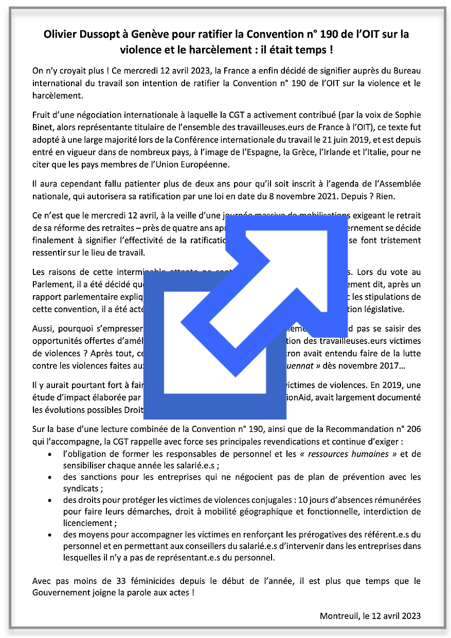Vous trouverez ci-joint le Communiqué CGT du 12 avril 2023 « Olivier Dussopt à Genève pour ratifier la Convention n° 190 de l’OIT sur la violence et le harcèlement : il était temps ! »