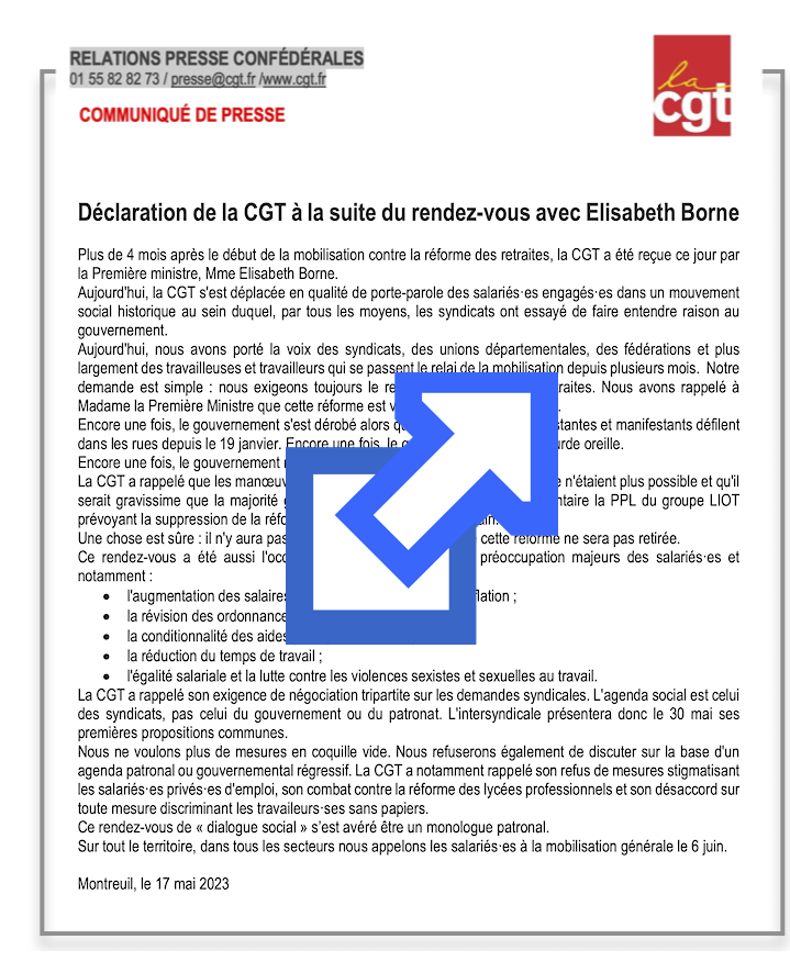 La CGT a rappelé que les manœuvres pour empêcher l’expression démocratique n’étaient plus possible et qu’il serait gravissime que la majorité gouvernementale retire de l’agenda parlementaire la PPL du groupe LIOT prévoyant la suppression de la réforme des retraites le 8 juin prochain.