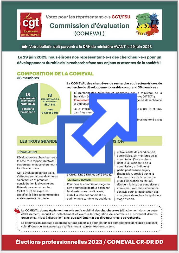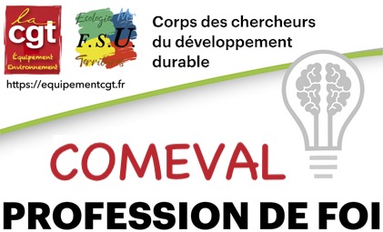 Ci-joint les Bulletins de vote et la Profession de foi des candidat-e-s CGT/FSU à la COMmission d’EVALuation compétente à l’égard des corps des Chargé-e-s de Recherche et Directeur-trice-s de Recherche du Développement Durable.