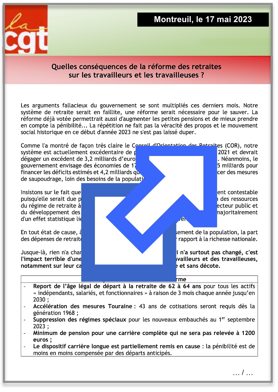 Note CGT du 17 mai 2023 : points essentiels de la réforme - tableau situation avant et après la réforme - tableau détaillant le calendrier du report de l’âge légal d’ouverture des droits - effets sur la santé et l’emploi - allongement du sas de précarité (...)