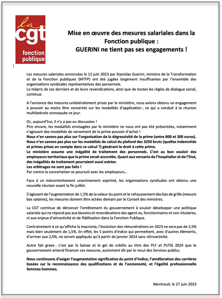 Communiqué CGT suite à une réunion le 27 juin 2023 sensée se tenir pour une concerter sur les modalités d’application des mesures unilatéralement prises par le ministère.