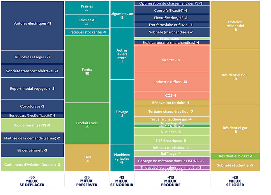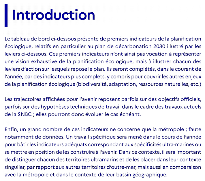 Un extrait de ce premier tableau de bord avait été présenté lors du Le Conseil national de la transition écologique (CNTE) 12 juillet dernier, avec un plan d’action de 52 leviers et la répartition de l’effort par secteur : voir notre article "Planification écologique : un programme pitoyable, présenté par Mme Borne le 12.07.2023 (mis à jour)".