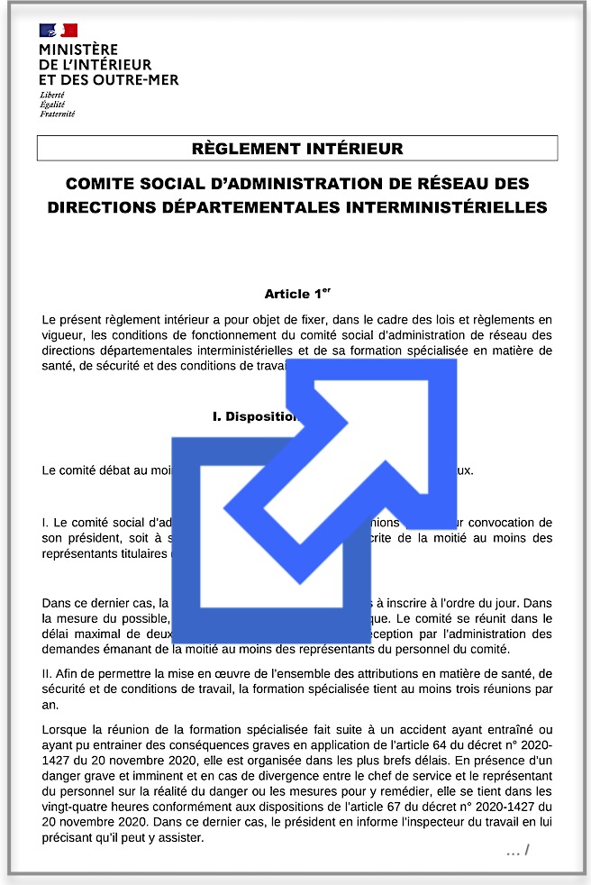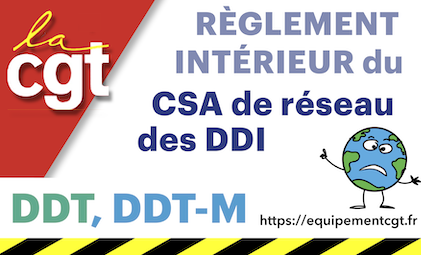 Ci-joint le réglement intérieur fixant les conditions de fonctionnement du CSA de réseau des DDI et de sa formation spécialisée en matière de santé, de sécurité et des conditions de travail.