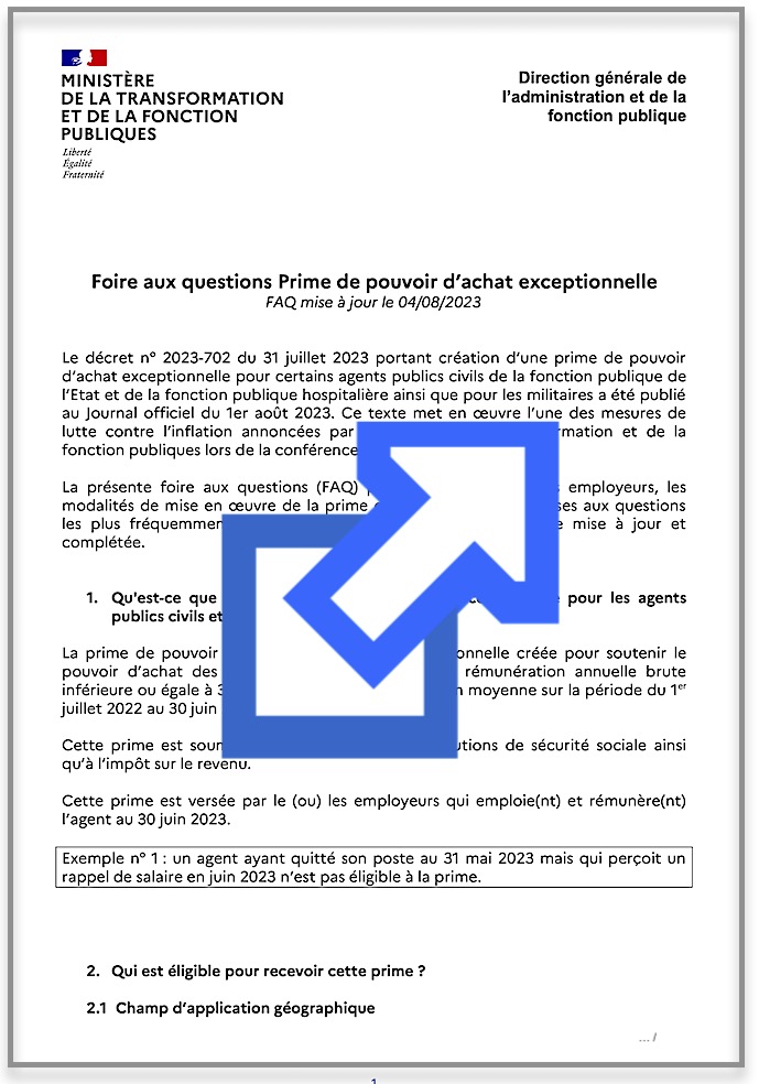 FAQ DGAFP mise à jour le 04/08/2023 précisant, à l’attention des employeurs, les modalités de mise en œuvre de la prime en proposant des réponses aux questions les plus fréquemment posées.