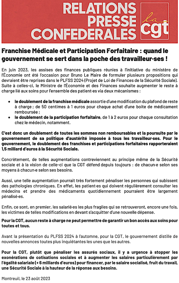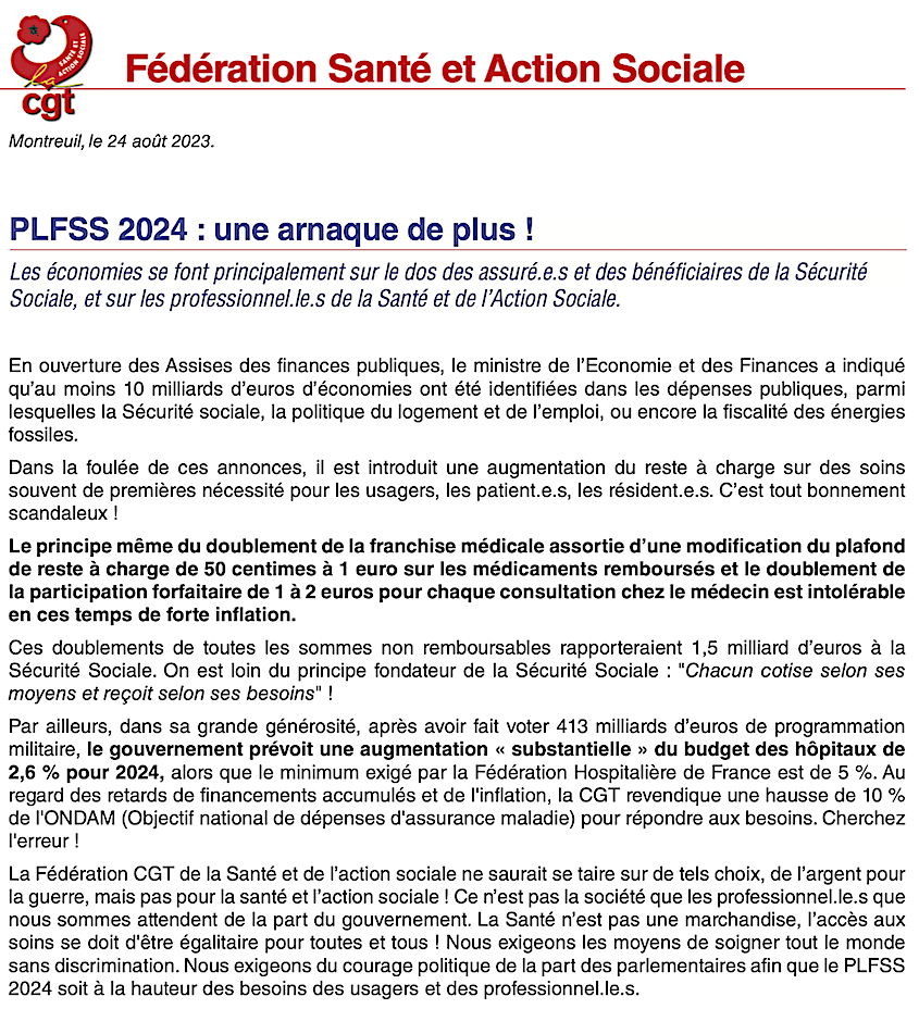 Ci-joint le Communiqués de presse CGT Santé Action sociale « PLFSS 2024 : une arnaque de plus ! » et le Communiqué CGT (confédération) « Franchise Médicale et Participation Forfaitaire : quand le gouvernement se sert dans la poche des travailleurses ! ».