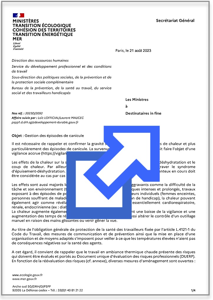 La liste des mesures de prévention que les employeurs publics doivent mettre en place face aux vagues de chaleur, afin de protéger la santé de leurs agents est publiée sur le portail de la Fonction Publique : lien direct.