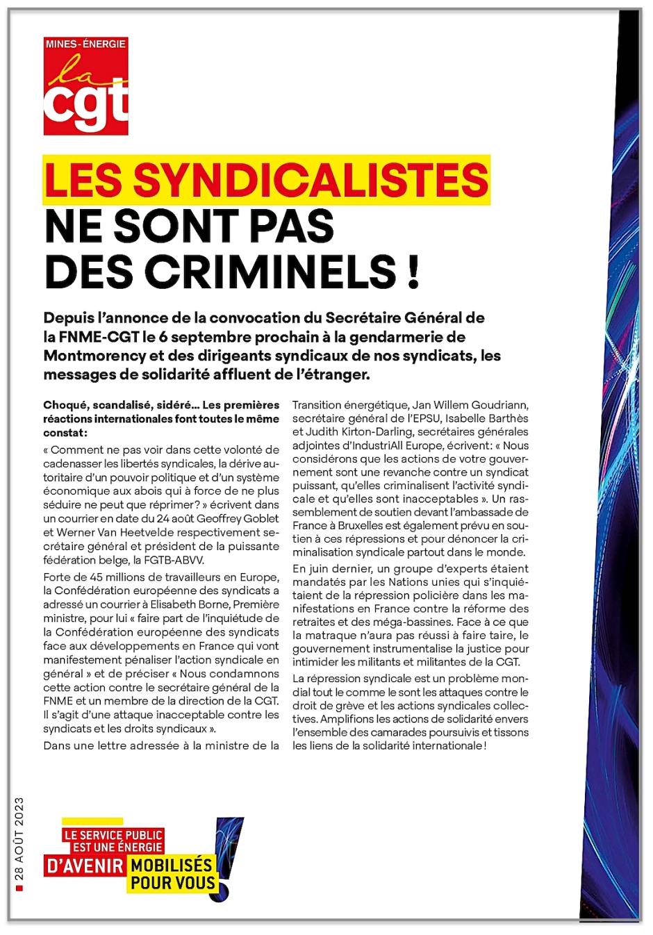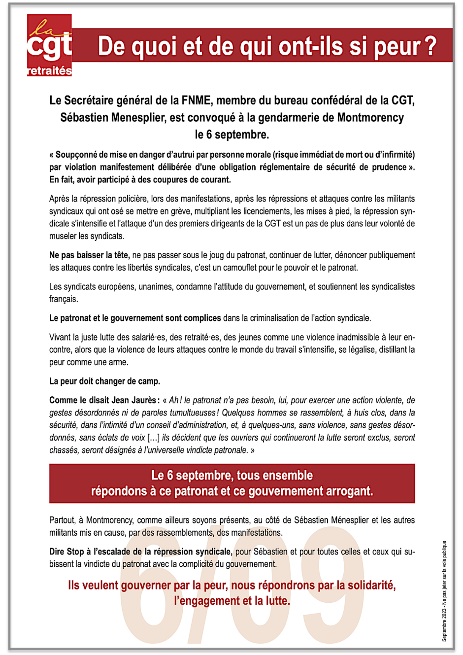 Depuis l’annonce de la convocation du SG de la FNME-CGT et membre du bureau confédéral le 6 septembre prochain, les messages de solidarité affluent des syndicats CGT mais également de l’étranger (voir les communiqués ci-après).