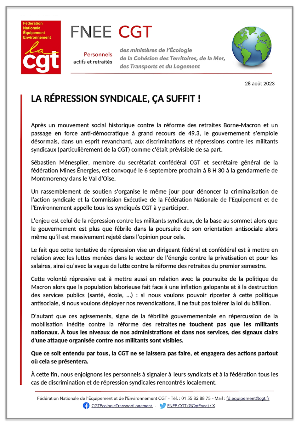 Communiqué de la FNEE-CGT concernant la répression syndicale qui s’intensifie avec notamment l’attaque d’un des premiers dirigeants de la CGT, Sébastien Menesplier.