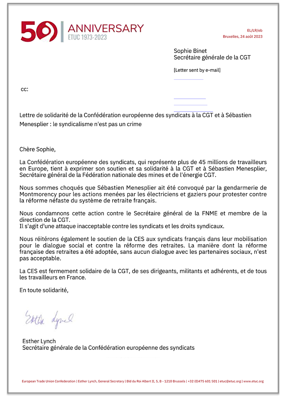 Lien direct vers la pétition lancée le 29 août 2023. L’EPSU* et IndustriAll Europe* s’associent à ce soutien. Un courrier a été envoyé à Mme Pannier-Runacher et une manifestation est organisée ce 6 septembre à Bruxelles devant l’Ambassade de France.