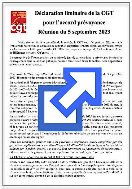 Communiqué intersyndical du 3 juillet 2023 et le Communiqué CGT du 28 juin 2023 « Le gouvernement doit VÉRITABLEMENT ouvrir les négociations sur la Prévoyance ». (L’accord « santé » dans la fonction publique de l’État, signé le 26.01.2022, comprenait un engagement du gouvernement à l’ouverture de négociations sur la prévoyance).