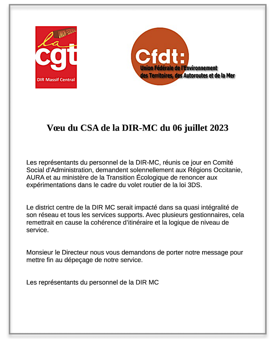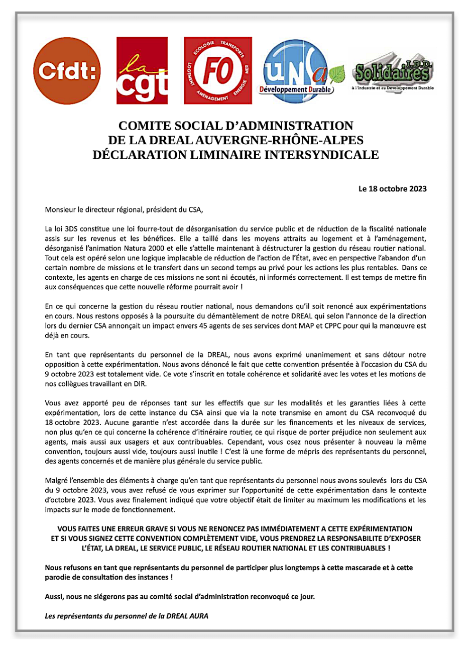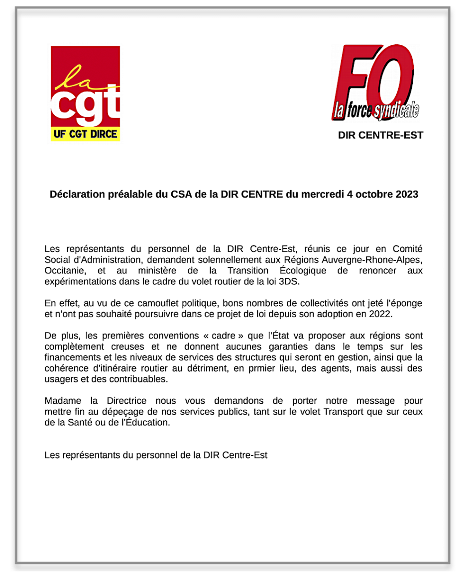 Motion et déclarations lues lors des CSA des DREAL AuRA, DIR Massif Central et DIR Centre-Est, relatives à la ferme opposition des organisations syndicales pour valider le projet de convention proposé par l’État à la Région Au-RA dans le cadre de la loi 3DS (expérimentation prévue de la mise à disposition d’une partie des services routiers à la région).