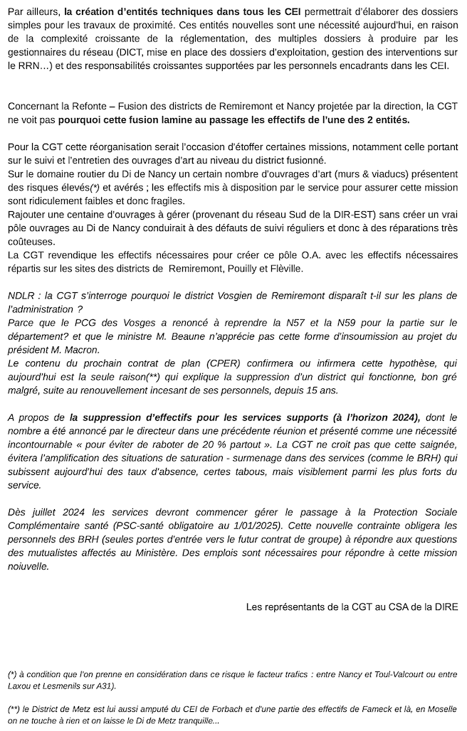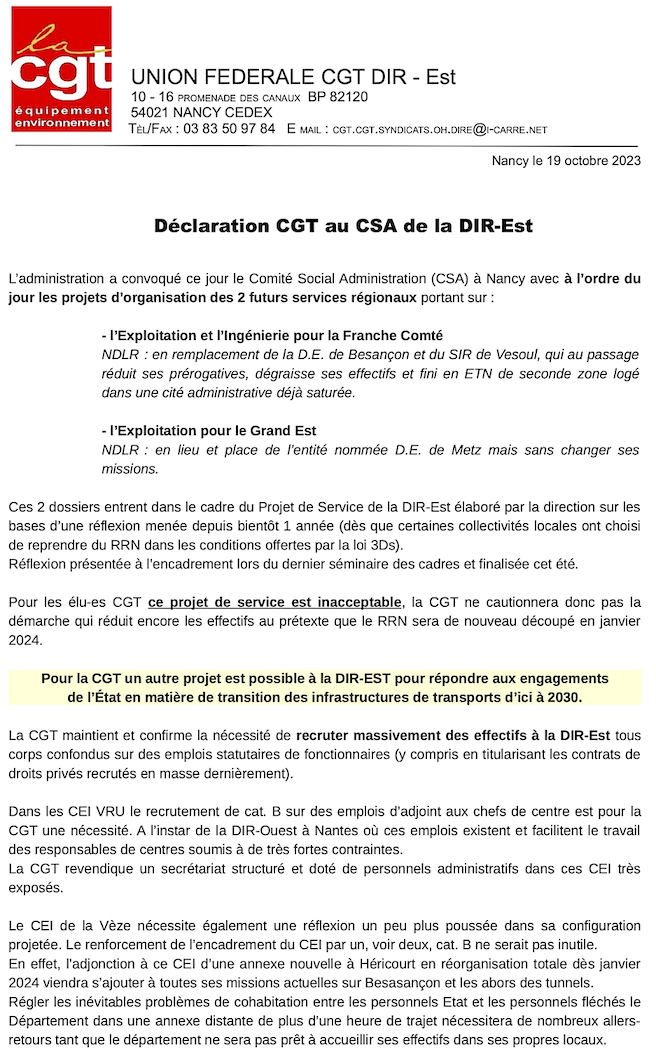 Déclaration CGT lue à l’ouverture de la réunion du Comité Social d’Administration (CSA) de la DIR-Est avec à l’ordre du jour les projets d’organisation des 2 futurs services régionaux : l’exploitation et l’ingénierie pour la Franche-Comté et l’exploitation pour le Grand-Est. Suite au vote CONTRE le projet de service par les syndicats, le CSA sera re-convoqué prochainement.