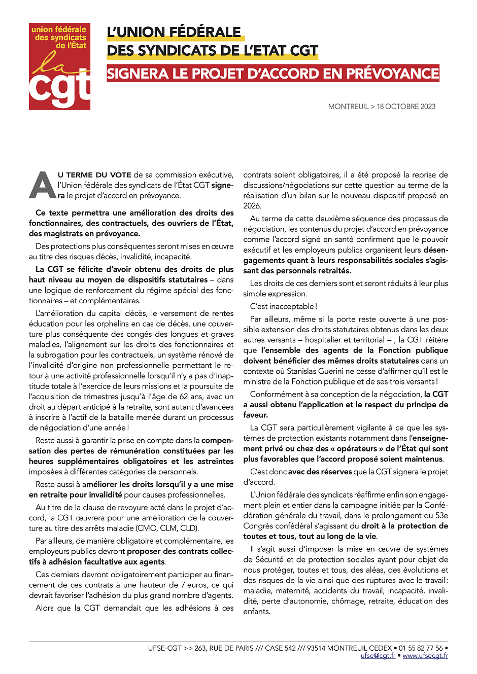 Communiqué intersyndical du 3 juillet 2023 et le Communiqué CGT du 28 juin 2023 « Le gouvernement doit VÉRITABLEMENT ouvrir les négociations sur la Prévoyance ». (L’accord « santé » dans la fonction publique de l’État, signé le 26.01.2022, comprenait un engagement du gouvernement à l’ouverture de négociations sur la prévoyance).