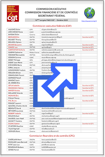 Liste des élus à la Commission exécutive (CE), la Commission financière et de contrôle (CFC) et au Secrétariat fédéral (SF) suite au 18e congrès de la FNEE CGT qui s’est déroulé du 09 au 13 octobre 2023 :