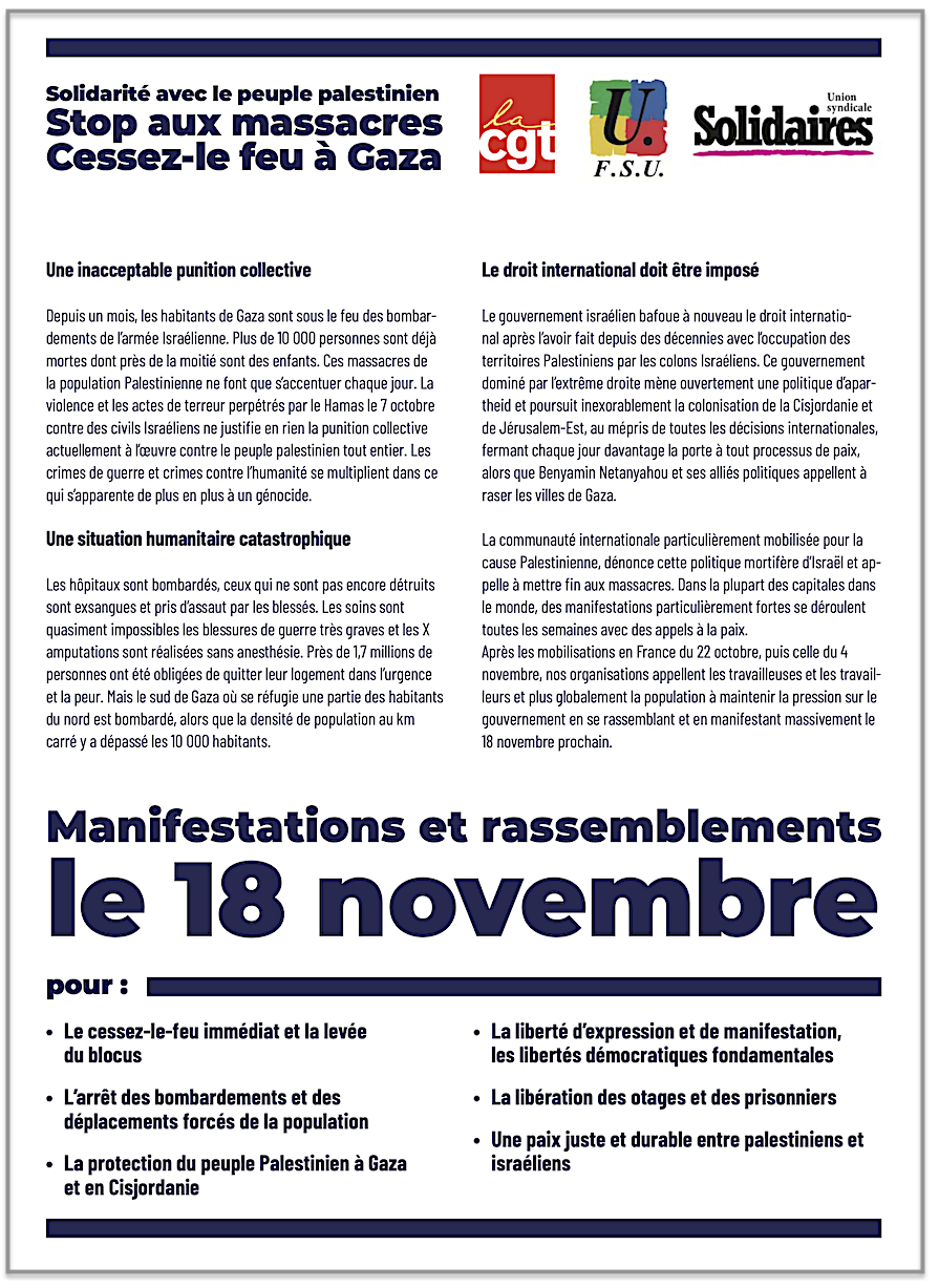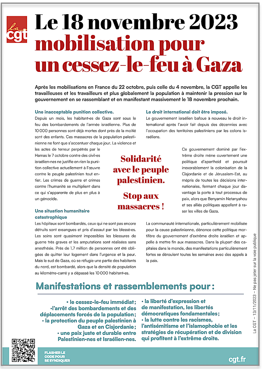 Vous trouverez ci-joint le Tract CGT du 13 novembre 2023 appelant les travailleuses et les travailleurs et plus globalement la population à maintenir la pression sur le gouvernement en se rassemblant et en manifestant massivement le 18 novembre prochain ainsi que l’Appel unitaire (CGT FSU Solidaires).