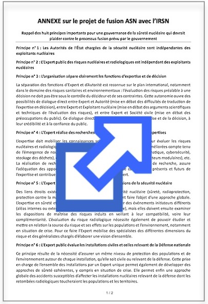 ● l’annexe sur le projet de fusion ASN avec l’IRSN : rappel des huit principes importants pour une gouvernance de la sûreté nucléaire qui devrait plaider contre le processus fusion prévu par le gouvernement