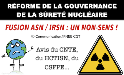 La CGT dénonce la fusion projetée des deux organismes nucléaires qui réunirait l’expertise (l’IRSN) et la décision (l’ASN) dont la séparation assurait justement une indépendance essentielle de l’expertise ! Une folie de vouloir renoncer à une organisation exemplaire et reconnue dans le monde entier.