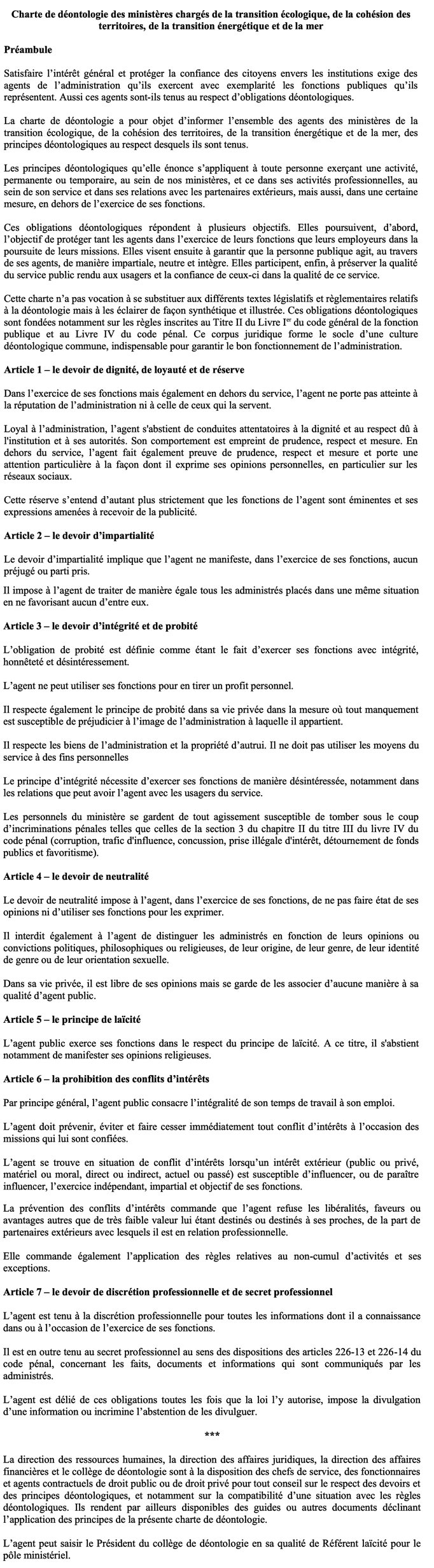 Arrêté du 29 décembre 2023 relatif à la charte de déontologie des ministères chargés de la transition écologique, de la cohésion des territoires, de la transition énergétique et de la mer publié le 30 décembre 2023 (TREK2335906A).