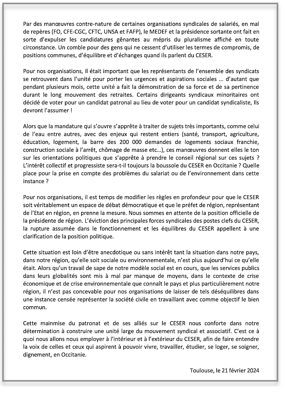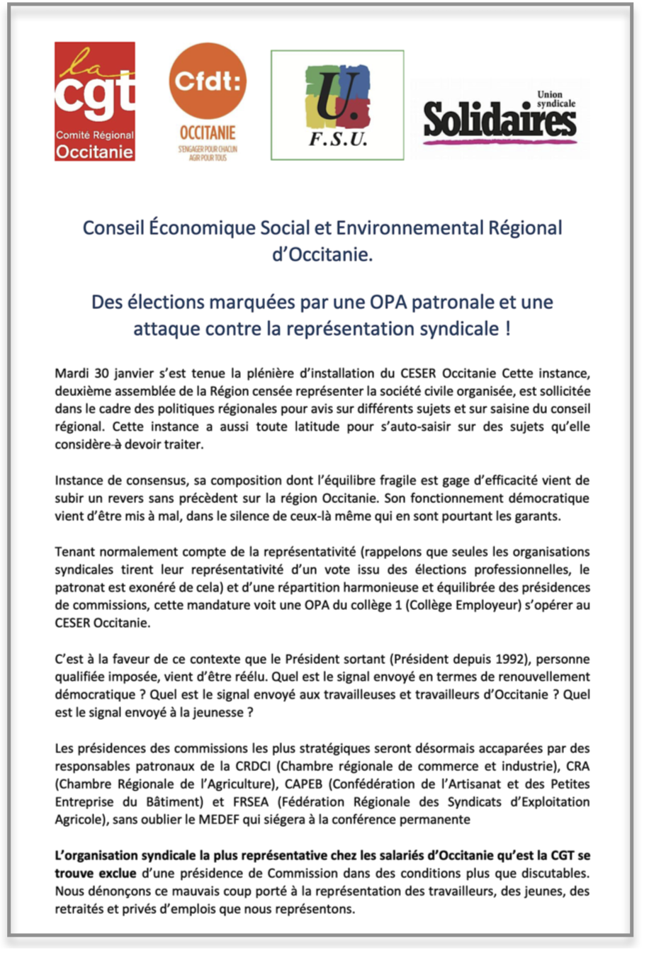 Communiqué intersyndical du 22 février 2024 « Conseil Économique Social et Environnemental Régional d’Occitanie. Des élections marquées par une OPA patronale et une attaque contre la représentation syndicale ! »