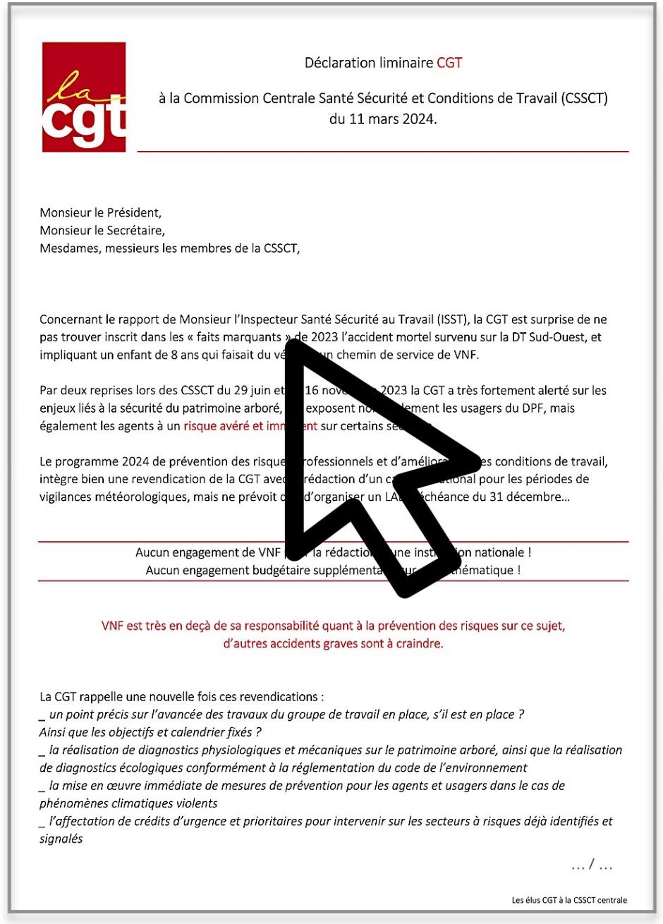 Déclaration liminaire CGT à la Commission Centrale Santé Sécurité et Conditions de Travail, CSSCT Centrale de VNF le 11 mars 2024.